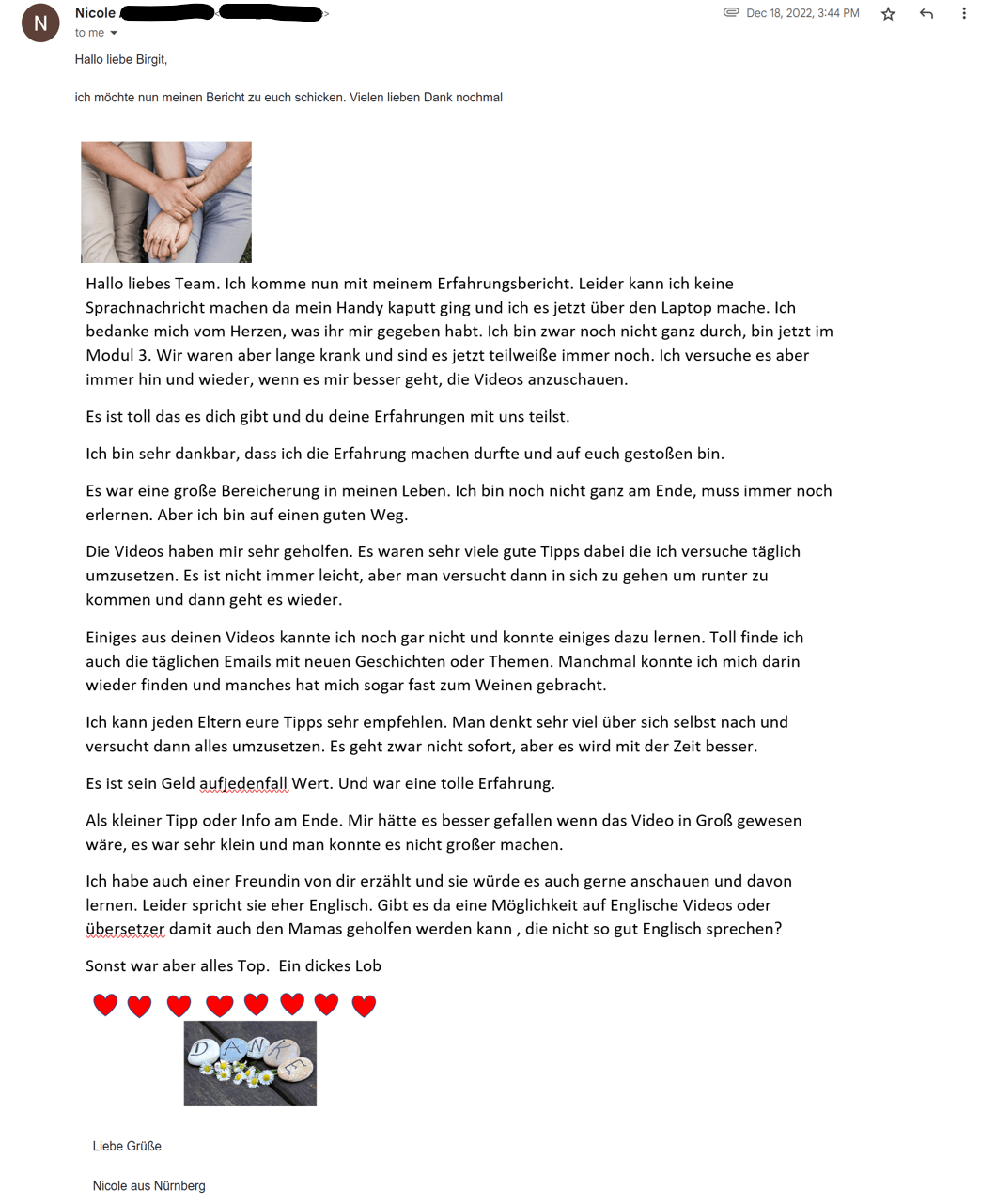 Ich habe mir dein 1-stündiges Seminar angehört. Einigen Sachen wusste ich schon, aber ganz viele Sachen waren mir nicht klar, was für Auswirkungen es auf mein Kind haben kann.